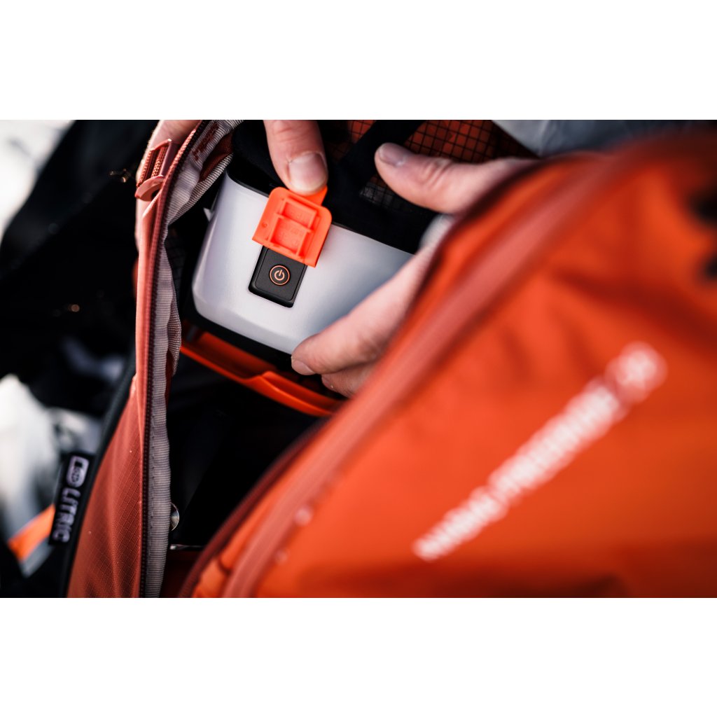 Na rozdíl od baterie, která využívá elektrochemické reakce, ukládá kondenzátor energii prostřednictvím statického náboje. Superkapacitor je ideální, když je potřeba krátkodobě velký výdej elektrické energie. Přesně tohle potřebuje ventilátor lavinového batohu pro naplnění airbagu okolním vzduchem. U LiTRICu je zdrojem energie integrovaný Li-Ion akumulátor, který znáš z mobilu. Dobíjení je velmi jednoduché - prostřednictvím kabelu USB-C, který je součástí balení. Nabíjení trvá 2-3 hodiny. Na jedno nabití je možné aktivovat airbag dvakrát, ale po první aktivaci je nutné počkat zhruba 25 minut, aby zregeneroval superkapacitor a druhé nafouknutí proběhlo bez problémů. Na boční straně batohu je v místě systému síťované okénko, kterým je vidět semafor, indikující stav nabití systému (Zelená / Oranžová / Červená).