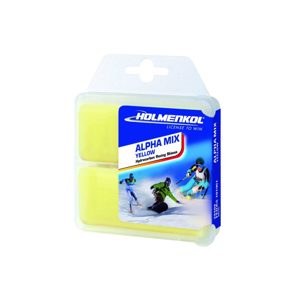 Alphamix ŽLUTÝ Kvalitní základní a tréninkový vosk na hydrokarbonové bázi. - pro měkký, nový a jemnozrnný sníh - pro teploty sněhu od 0° do -4 °C - vyniká svou extrémní odolností vůči otěru - zažehlovací teplota 115 ~ 125 °C