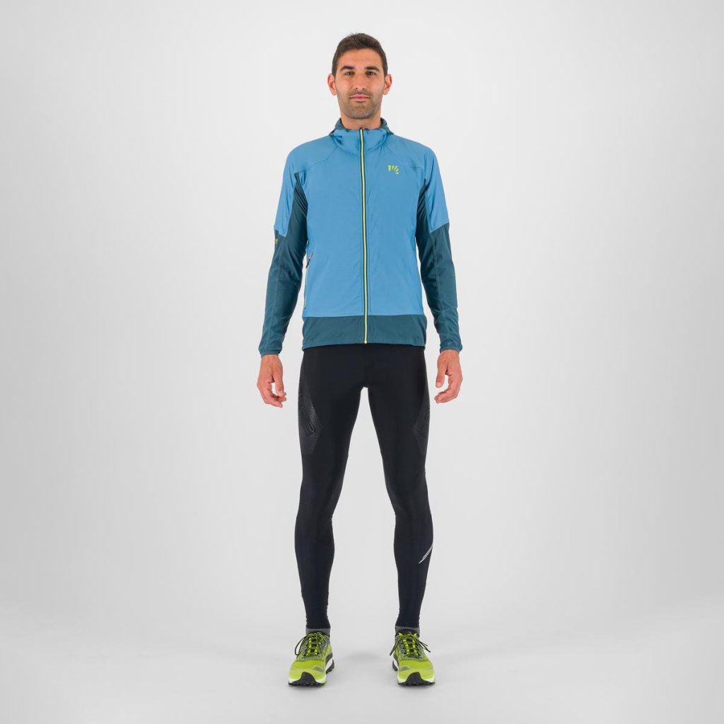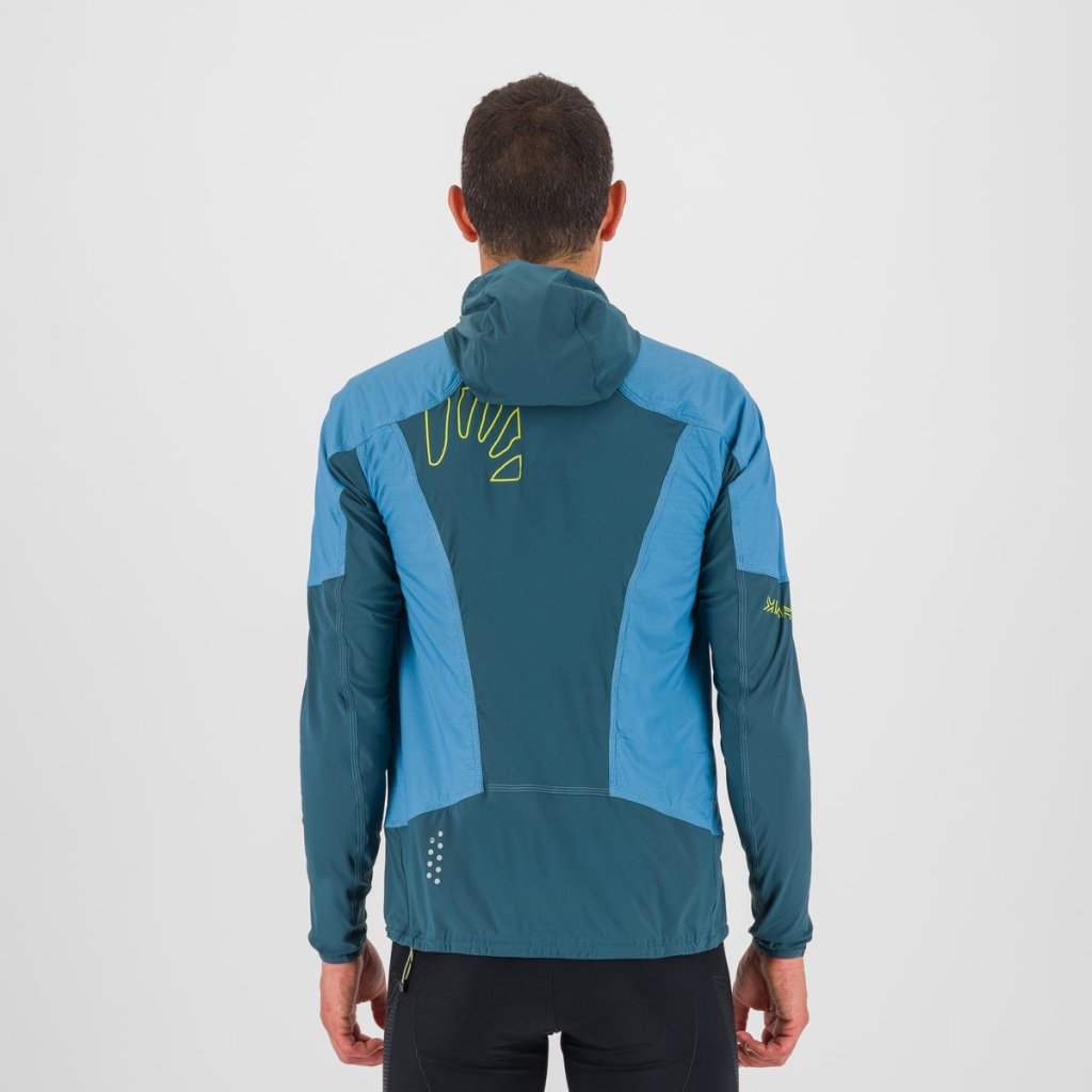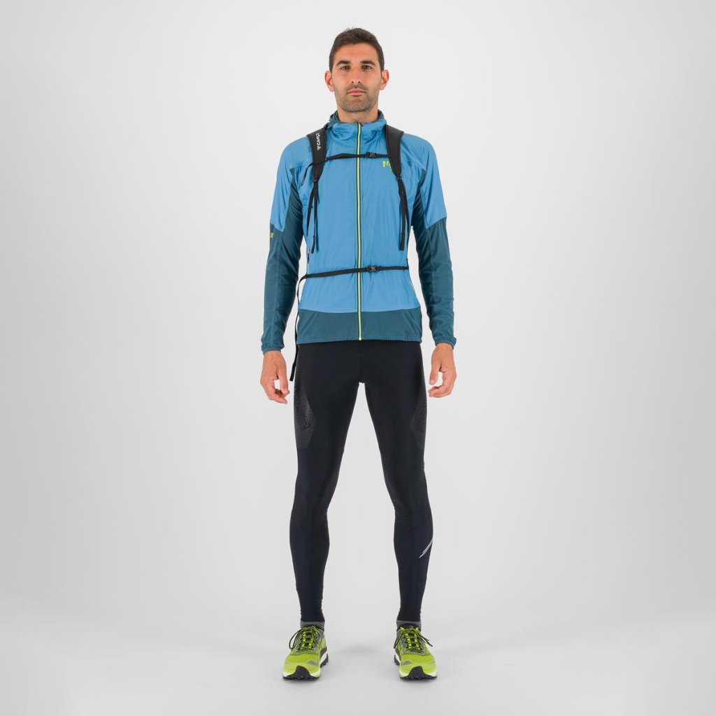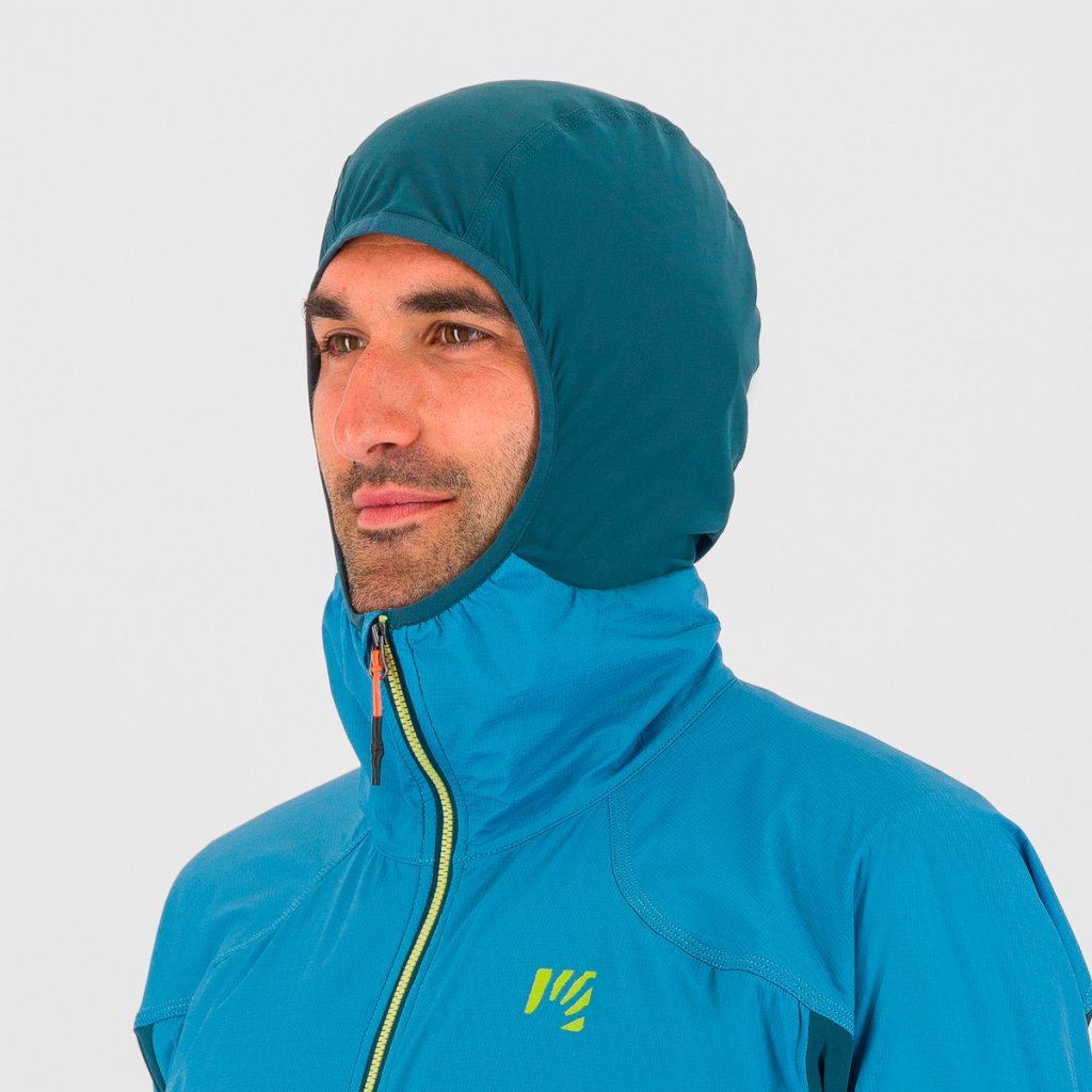 Letní větrovka plnéná polartecem alpha v modrých částech, jinak velmi prodyšná mikina pod paží a na zádech. Kapuce, dvě boční kapsy na zip. Sbalitelná, lehká a superprodyšná, vhodná na běhání, kolo, turistiku.