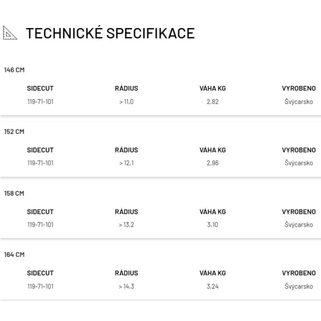 ADAPTIVE CONTACT LENGHT – nejširší bod přední části lyže posunut dopředu + mírný rocker v špici, čím větší náklon lyže, tím větší kontakt hrany se sněhem; zlepšuje grip i stabilitu.